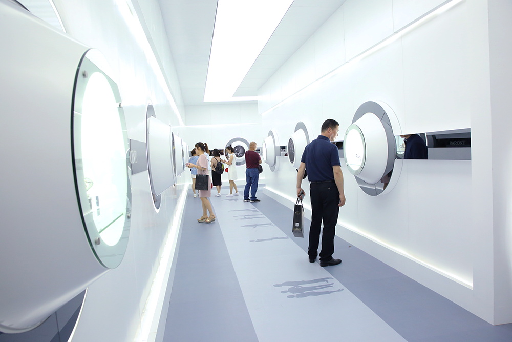 今年的雷諾表展館展臺以波浪形的表帶及表盤合成抽象的圓形表盤,并配以燈光,極具視覺沖擊力,白色的線條猶如鋼琴的琴鍵,流暢而優(yōu)美,環(huán)繞展臺四周,時(shí)間與優(yōu)雅的生活完美融合,并在入口處設(shè)置時(shí)光隧道,光影穿梭,引領(lǐng)全新的商務(wù)體驗(yàn)和潮流。展館內(nèi)的流水幕墻,寓意著時(shí)光的流動完美融合其中,展示效果更為生動。