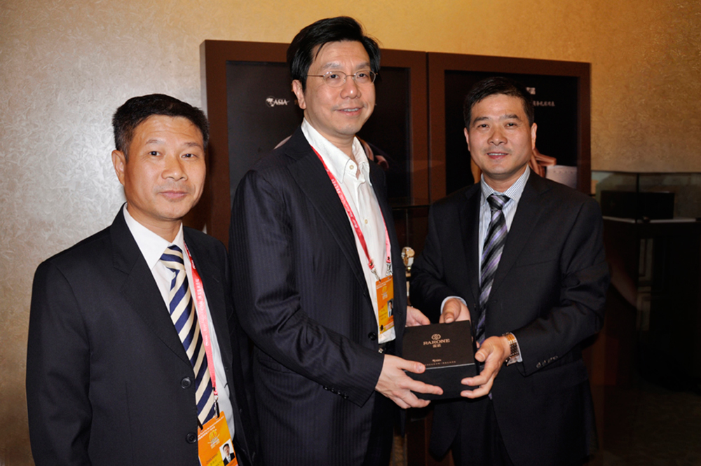 雷諾表業(yè)董事長詹西洲、總經(jīng)理詹江洲親自贈送博鰲紀念表予李開復博士(中),并合影留念